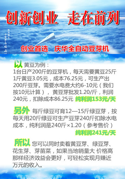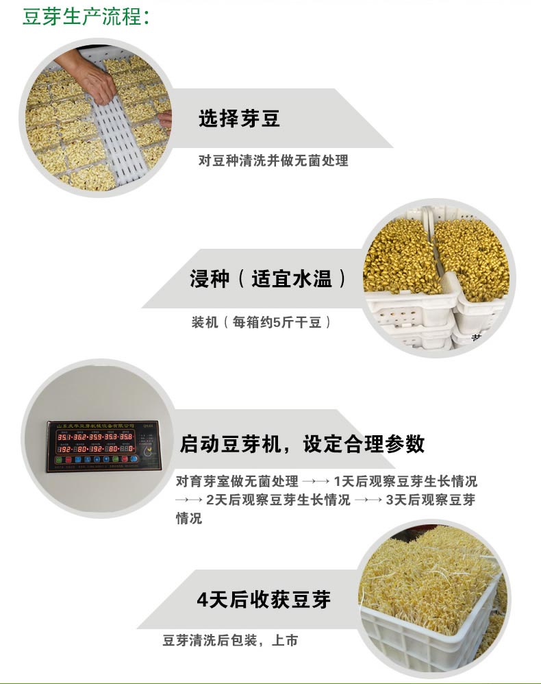 3、豆芽生產(chǎn)流程: 選擇芽豆 →→ 對(duì)豆種清洗并做無菌處理 →→ 浸種(適宜水溫) →→ 裝機(jī)(每箱約5斤干豆) →→ 啟動(dòng)豆芽機(jī),設(shè)定合理參數(shù) →→ 對(duì)育芽室做無菌處理 →→ 1天后觀察豆芽生長(zhǎng)情況 →→ 2天后觀察豆芽生長(zhǎng)情況 →→ 3天后觀察豆芽情況 →→ 4天后收獲豆芽 →→ 豆芽清洗后包裝,上市。