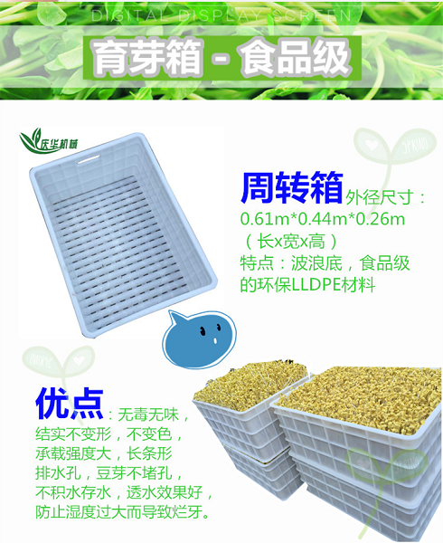 6、豆芽機(jī)結(jié)構(gòu)特點(diǎn)及功能(可根據(jù)客戶需要訂做): 4)周轉(zhuǎn)箱的外徑尺寸:0.61m*0.44m*0.26m(長(zhǎng)寬高),特點(diǎn):波浪底,食品級(jí)的環(huán)保LLDPE材料,無味,結(jié)實(shí)不變形,不變色,承載強(qiáng)度大,長(zhǎng)條形排水孔,豆芽不堵孔,不積水存水,透水效果好,防止?jié)穸冗^大而導(dǎo)致爛牙。