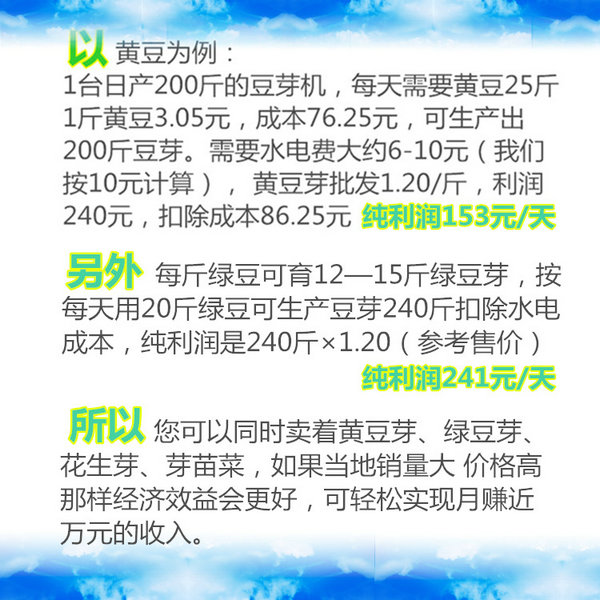 3、豆芽生產(chǎn)流程: 選擇芽豆 →→ 對(duì)豆種清洗并做無菌處理 →→ 浸種(適宜水溫) →→ 裝機(jī)(每箱約5斤干豆) →→ 啟動(dòng)豆芽機(jī),設(shè)定合理參數(shù) →→ 對(duì)育芽室做無菌處理 →→ 1天后觀察豆芽生長(zhǎng)情況 →→ 2天后觀察豆芽生長(zhǎng)情況 →→ 3天后觀察豆芽情況 →→ 4天后收獲豆芽 →→ 豆芽清洗后包裝,上市。
